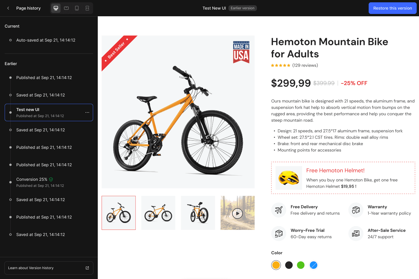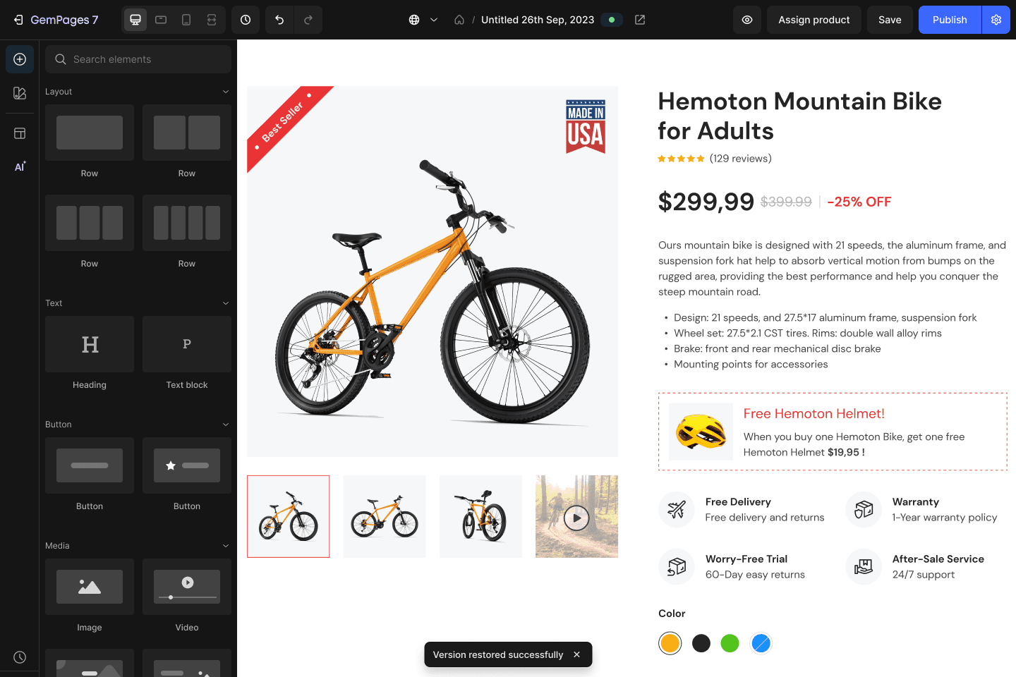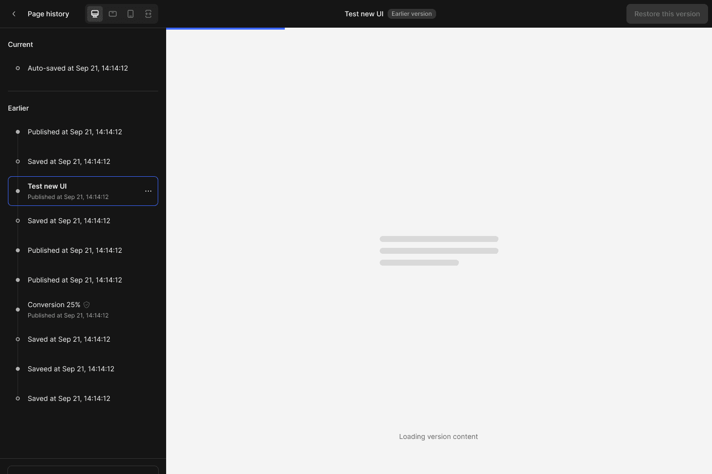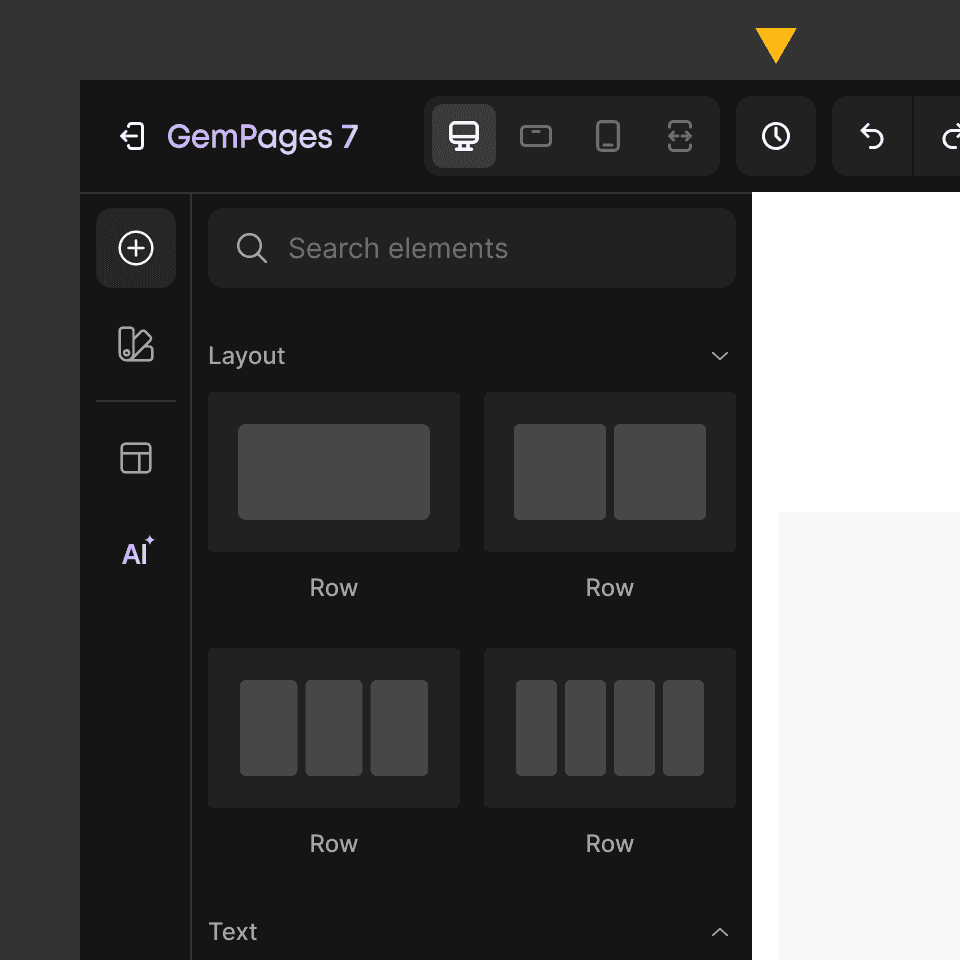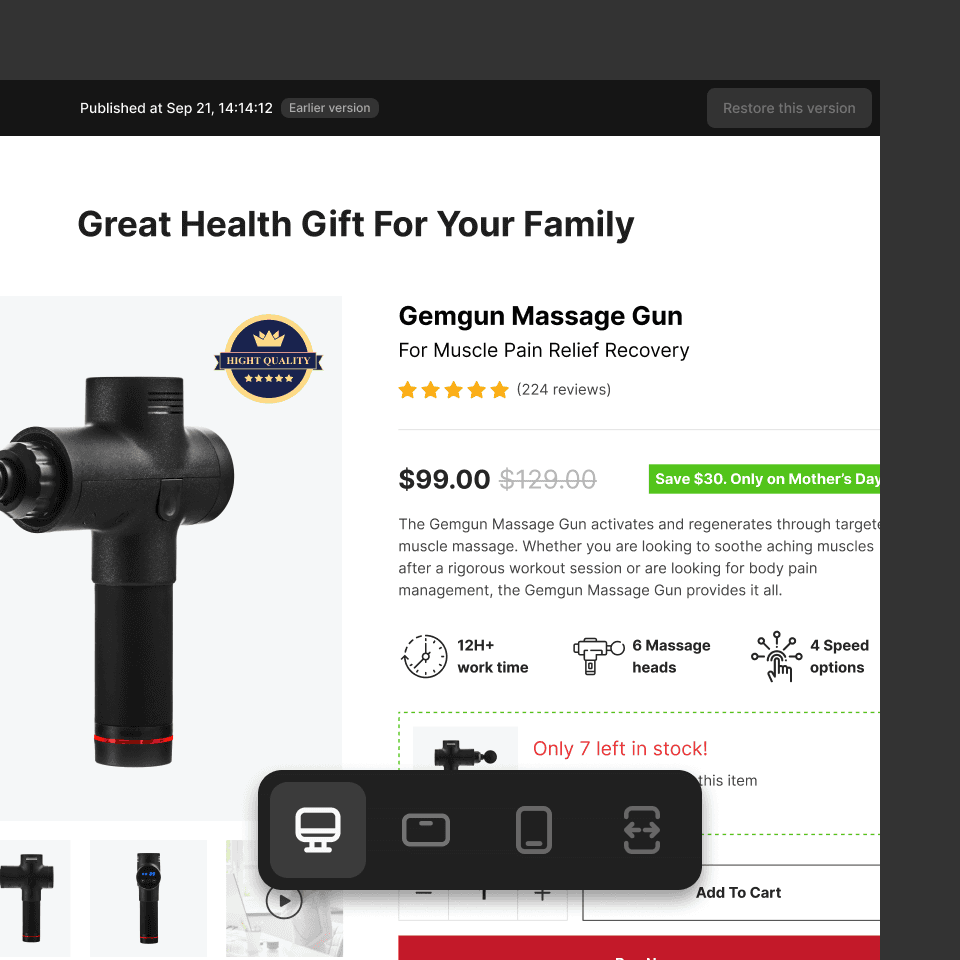 Version History is a powerful feature in GemPages v7, allowing users to view and restore all previous versions of their pages directly in the editor.