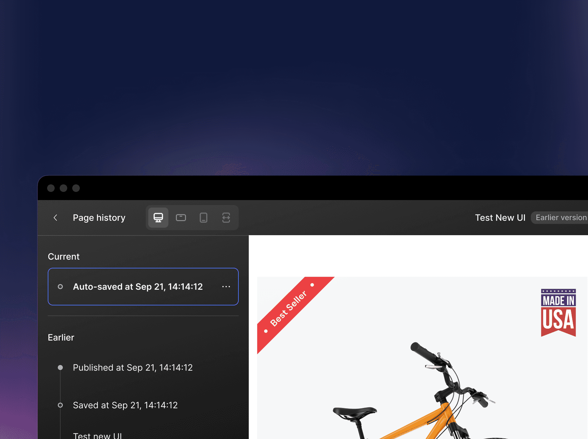 Utilize the Design Area to preview the old version and swiftly switch designs for different devices - just like users always do when building a page.